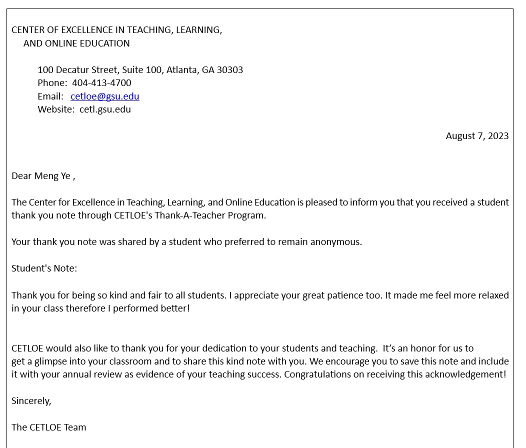 “Thank you for being so kind and fair to all students. I appreciate your great patience too. It made me feel more relaxed in your class; therefore, I performed better!”